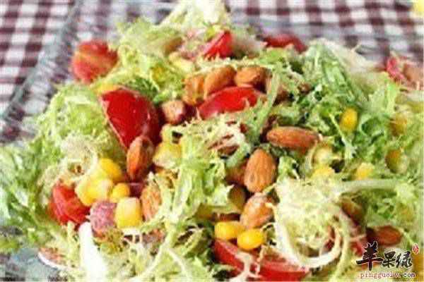 杏仁 15颗、苦菊菜1小把、圣女果10个、玉米粒50克、